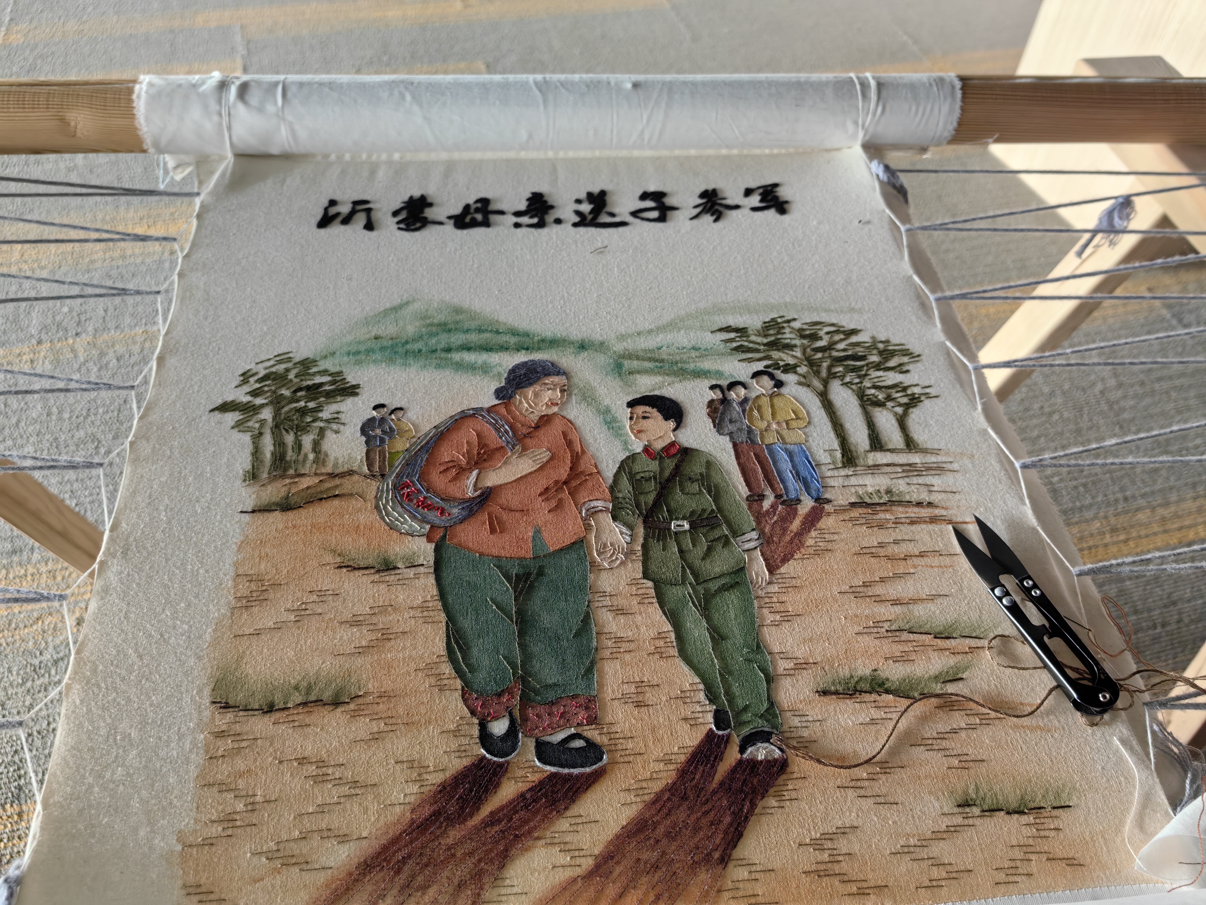 卞成飞:“去年冬天,我和我们非遗工坊的几位绣娘,用两个多月的时间绣了十几副'我的家乡沂蒙山板栗'、‘山楂秋收’的这种喜悦。这几幅作品今年在武汉展出的时候,有一位老战士,他带着他的战友过来看展,他看到图片里的这种繁华的景象,当时他拉着我的手说,当年我们打仗就是盼着家乡能够过上这样的好日子,没想到你们能用针线把它绣出来了,真好!当时我觉得这一刻我们所有的坚持非常值得。手绣不仅没有消失,还跟着时代一起成长。”