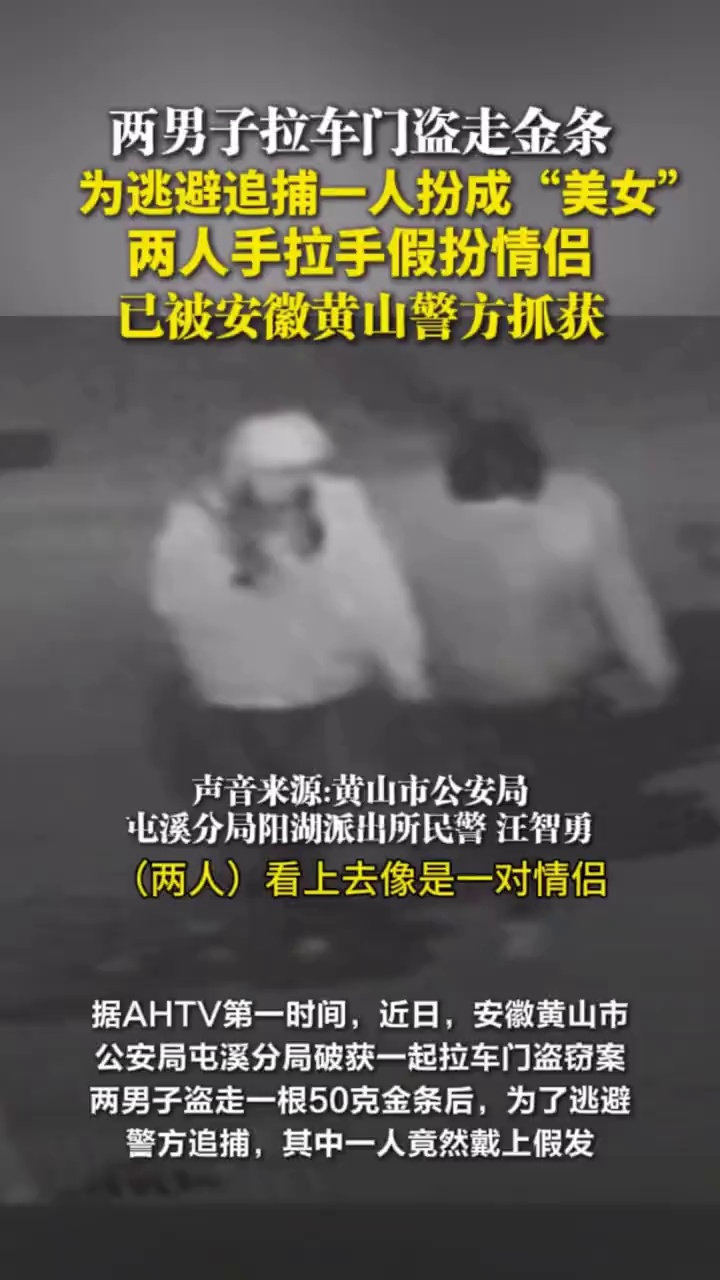 两男子拉车门盗走金条,为逃避追捕一人扮成“美女”,两人手拉手假扮情侣,已被安徽黄山警方抓获