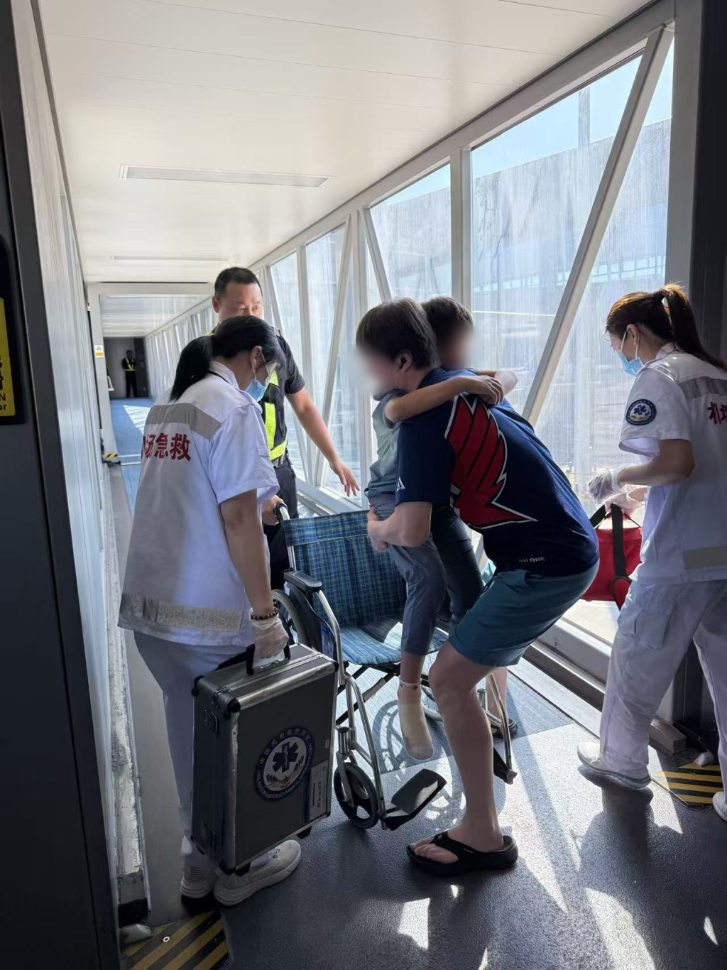 9时2分,承载着生命希望的MU5627航班平稳降落在青岛机场。飞机按照最优路径滑行,迅速停靠在指定廊桥。舱门开启后,地服人员和机场急救人员立即上前参与急救和保障工作,使用升降平台车安全、平稳地将患儿转移至救护车。从开舱门到救护车驶离,整个过程仅耗时约9分钟,为患儿争取了宝贵的救治时间。
