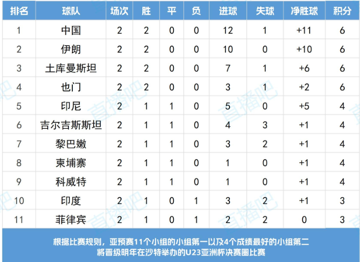 但最坏的情况是U23国足输球,理论上依然有希望出线,但要看两种情况:一是确保小比分输给澳大利亚,在0比2以内,净胜球确保9个及以上。同时还要看其他小组第二的末轮发挥: