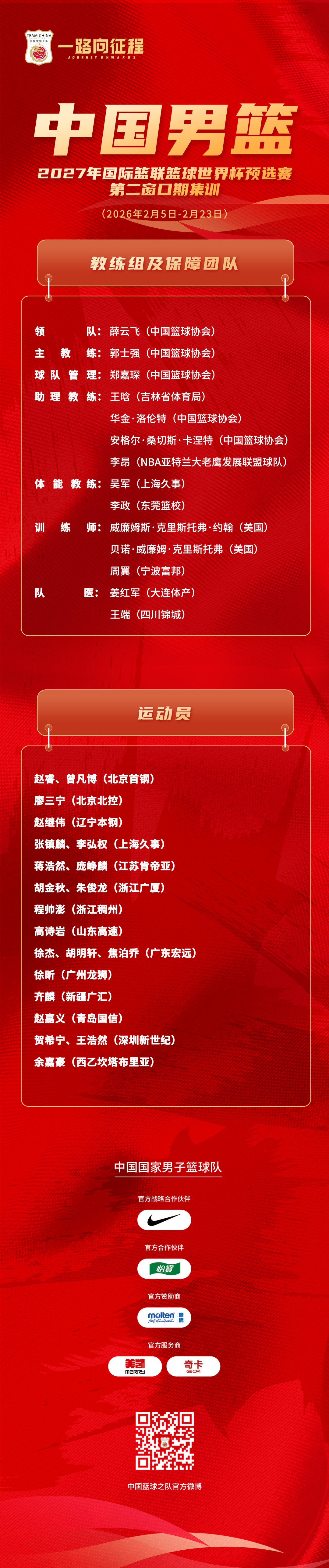 为备战国际篮联2027篮球世界杯预选赛第二窗口期比赛,中国篮球协会计划于2月5日至2月23日在国家体育总局训练局组织国家男篮集训。