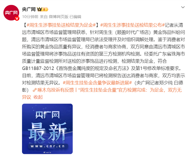 据央广网2月5日晚消息,记者从清远市清城区市场监督管理局获悉,针对周生生(顺盈时代广场店)黄金饰品纠纷问题,清远市清城区市场监督管理局已依法受理并及时组织调解处理。鉴于消费者对所购买的黄金饰品质量有异议,经消费者与商家协商,双方同意由清远市清城区市场监督管理局将涉事饰品送往有资质的第三方检测机构检测。