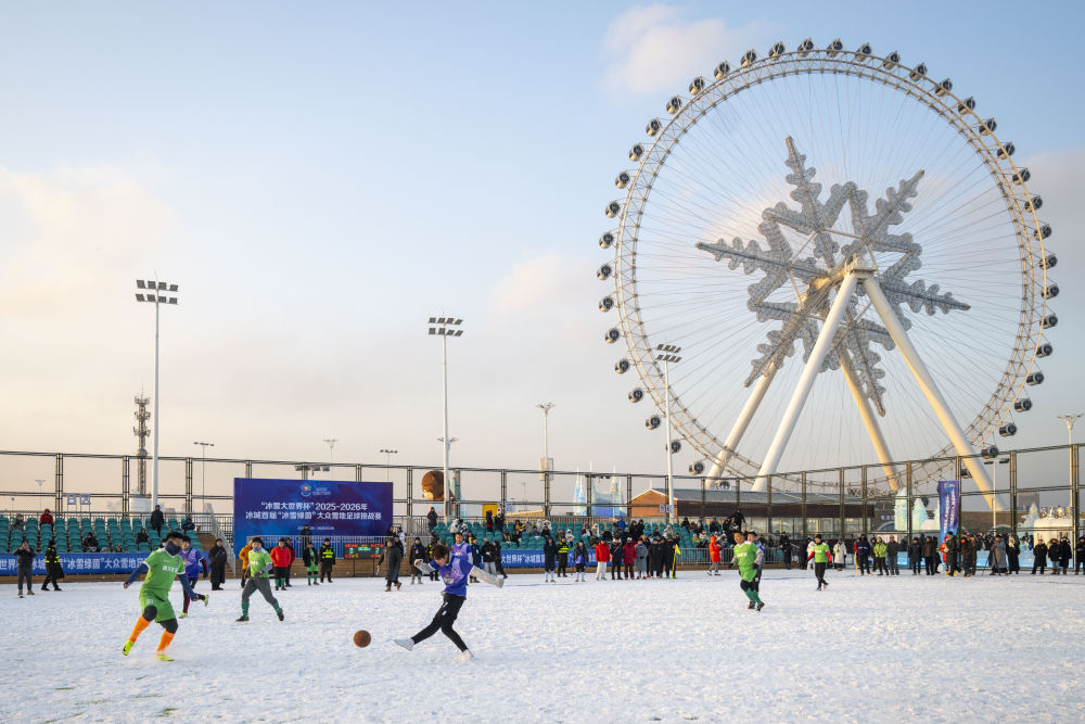 2025年12月20日,参赛球员们在哈尔滨市“冰超”系列冰雪赛事启动仪式暨“冰雪大世界杯”2025-2026年冰城首届“冰雪绿茵”大众雪地足球挑战赛中。新华社记者 张涛 摄