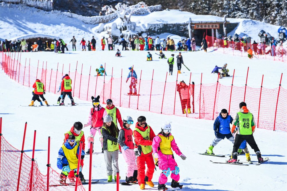 2026年2月2日,在江西省宜春市铜鼓县排埠镇七星岭滑雪场,参加冰雪冬令营的学生在教练的带领下体验冰雪运动。新华社发(周亮 摄)