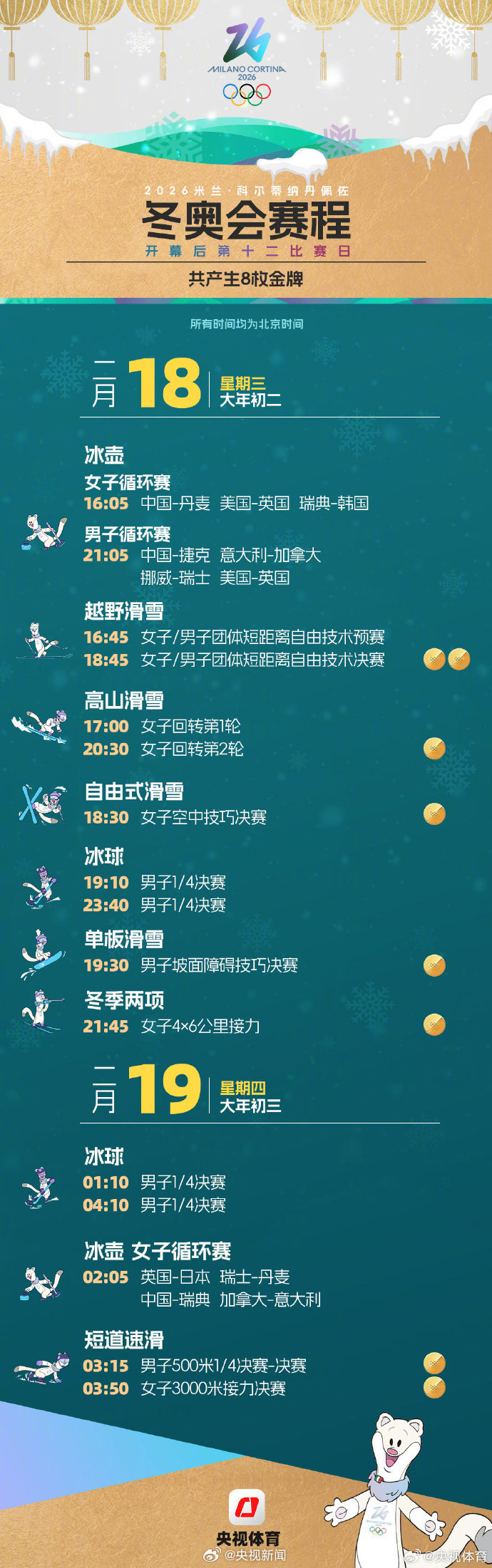 米兰冬奥会开幕、徐梦桃、谷爱凌、苏翊鸣、隋文静、韩聪、林孝埈、范可新、齐广璞、高亭宇、王诗玥、柳鑫宇、金博洋等126名中国冰雪健儿开启逐梦之旅!从2月7日到2月22日,冰壶、滑雪、速滑、冰球、花滑等精彩赛事将轮番上演,116枚金牌将陆续诞生。一起为冰雪健儿加油! (央视新闻)