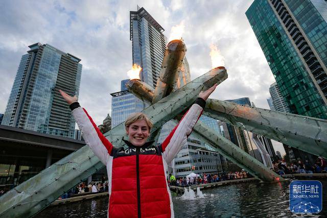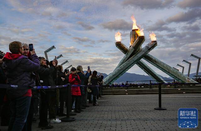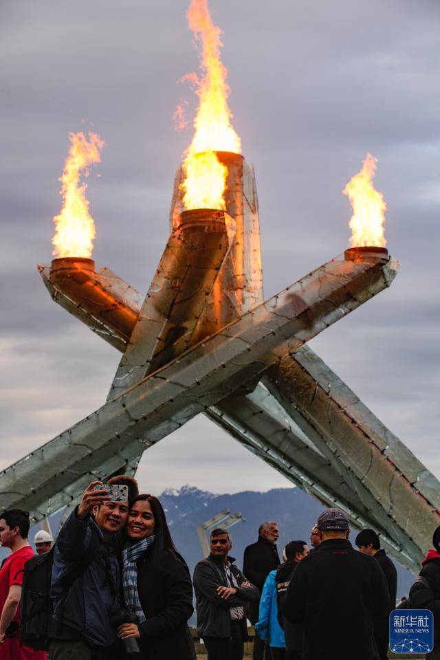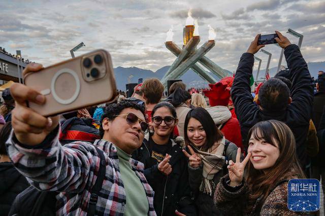 ↑ 人们在加拿大温哥华市中心的奥林匹克圣火台前拍照留念。