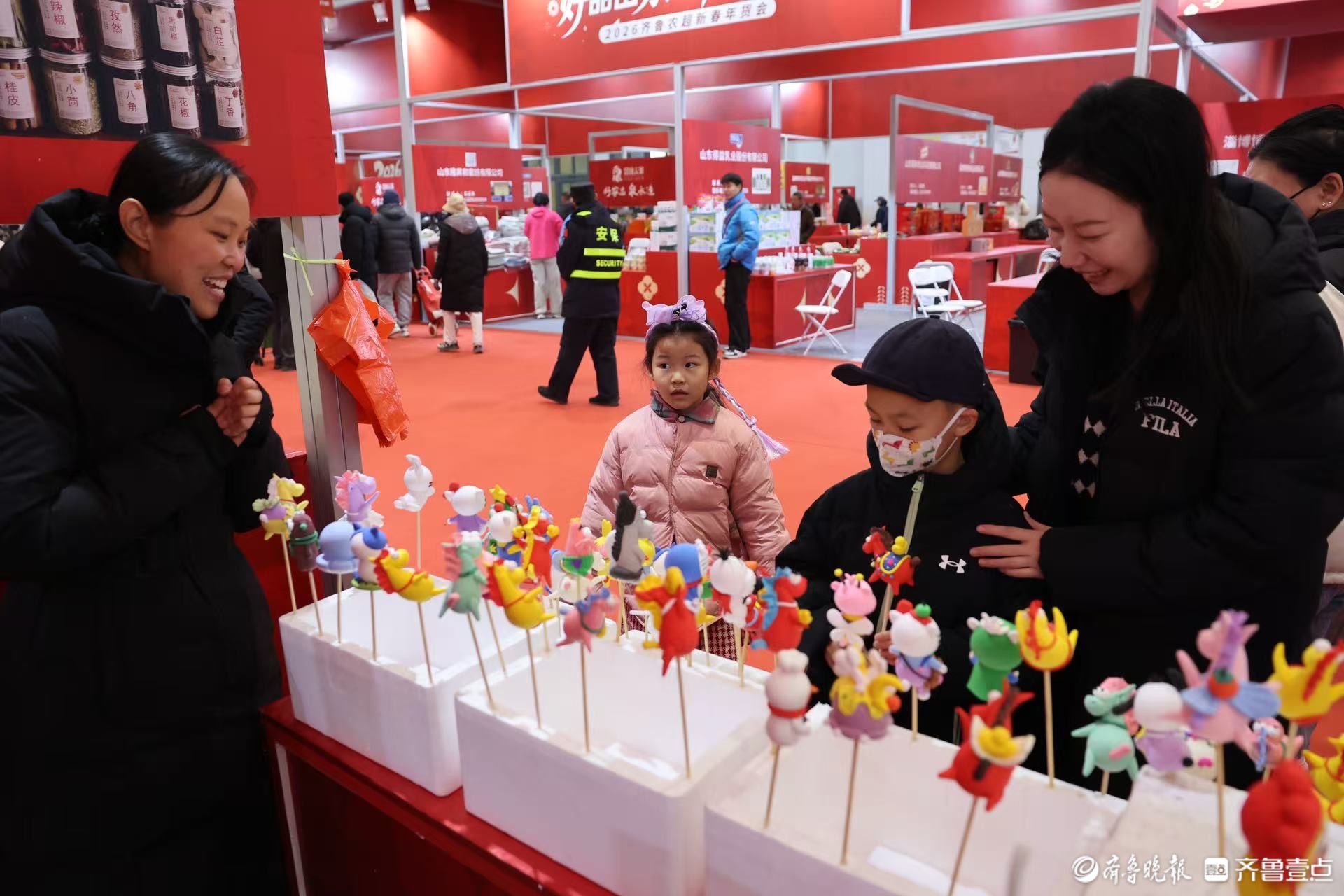 2月8日,2026齐鲁农超新春年货会进入最后一天,山东国际会展中心4号馆迎来众多萌娃,现场欢笑不断。传统民俗好物与儿童手工、卡通玩具、非遗面塑等深受小朋友追捧,孩子们围着展位兴致勃勃,家长们也纷纷选购,把这份童趣与年味一起带回家。