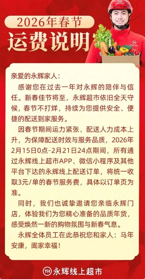 永辉超市发布春节运费说明:2026年2月15日0点-2月21日24点期间,所有通过永辉线上超市APP、微信小程序及其他平台下达的永辉线上配送订单,将统一收取3元/单的春节服务费,具体以订单页为准。