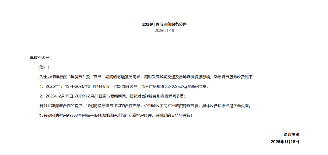 德邦快递1月8日在官网发布的公告中提到,为全力保障您在“年货节”及“春节”期间的寄递服务需求,同时受高峰期交通及各地调度资源影响,收取动态调节服务费。2026年1月19日—2026年2月14日期间,将对部分客户、部分产品加收0.2—0.5元/kg资源调节费;2026年2月15日—2026年2月23日春节假期期间,德邦对寄递服务加收资源调节费;针对长期深度合作的客户,将按照合作产品,分别加收不同标准的资源调节费。
