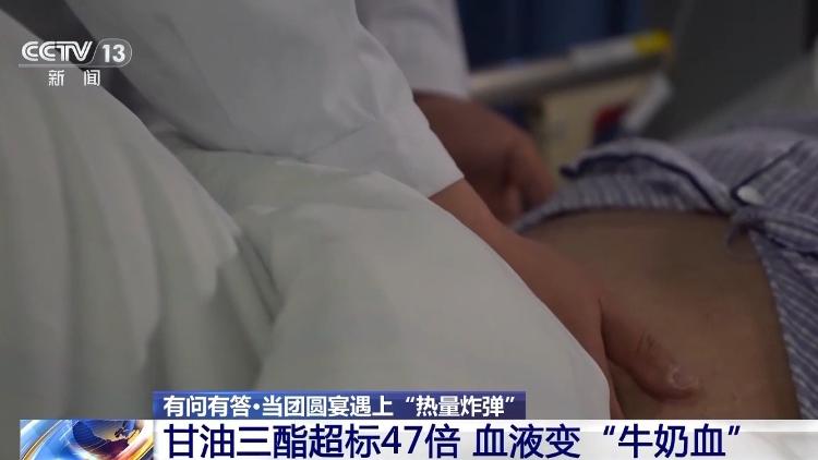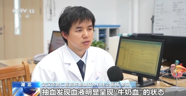 武汉市普仁医院肝胆胰疝外科主治医师 罗刚:抽血发现血液明显呈现“牛奶血”的状态。入院查时,血脂已大于80毫摩尔每升,正常的血脂甘油三酯小于1.7毫摩尔每升。入院后抽的静脉血明显是脂肪化的血液。
