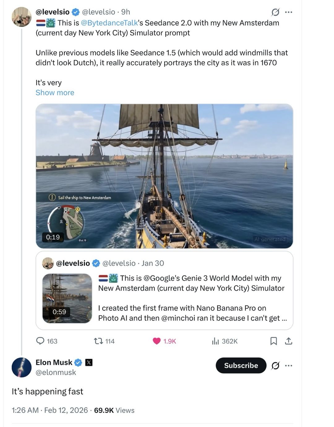 马斯克点评Seedance2.0在视频效果上的进步
