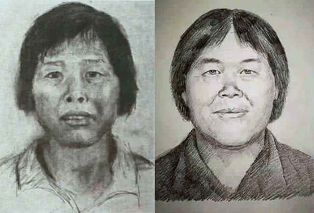 知情人士称,“梅姨”长相与之前公布的的模拟画像相似度不到百分之三十。左图为广州警方公布,右图为画像专家林宇辉绘制。受访者供图