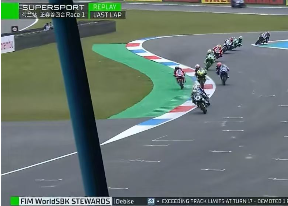 WSBK赛事规则对最后一圈的赛道限制违规有特别规定:若车手在最后一圈超出赛道限制并获得优势,将被罚退一个完赛位置,旨在防止车手在比赛关键时刻通过切弯或驶出赛道获取不正当优势。值得注意的是,该处罚仅适用于最后一圈的获利性违规,常规圈次的赛道限制违规通常以单圈成绩被取消或加罚时间等方式处理。德比斯正是在这一规则下,从原本的第三名被罚退至第四名,领奖台第三的位置由凯旋车队的英国车手阿莫斯递补获得。