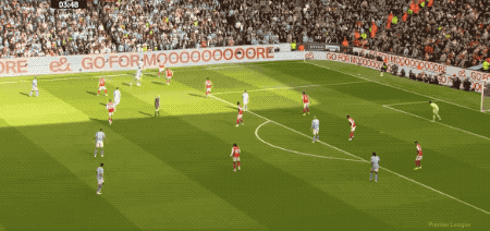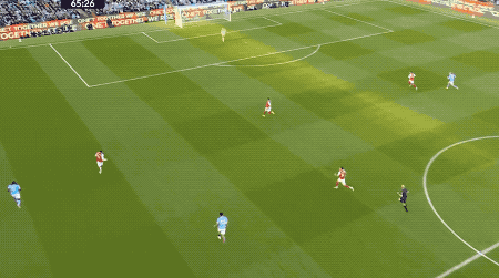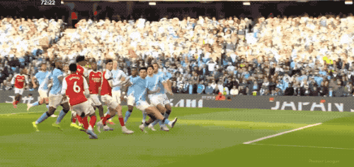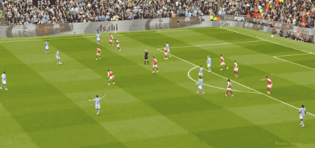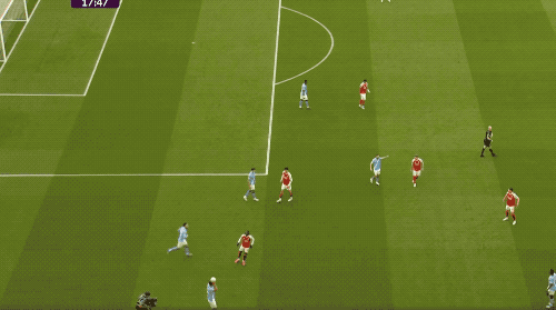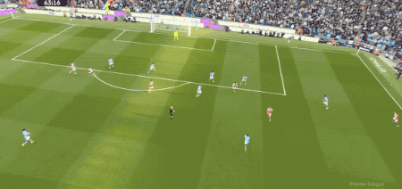 第64分,曼城打出快速进攻,奥赖利传球,罗德里一脚踢空,哈兰德抢在加布里埃尔之前,将球打进。
