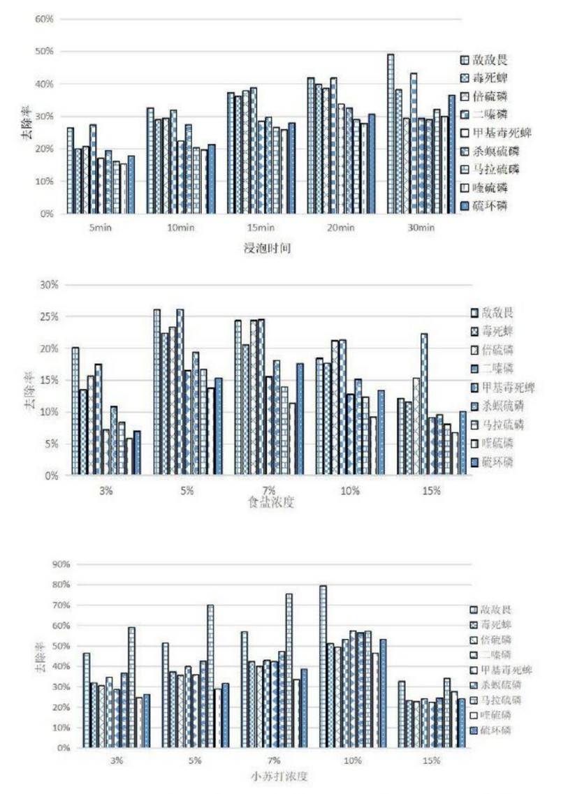 此外,国内也有不少学者研究了碳酸氢钠对农药的去除效果,比如山西省夏县综合检验检测中心的研究者找来了更多种农药,选择了9种有机磷农药。清洗方式包括用清水、食盐水(浓度包括3%、5%、7%、10%、15%)、小苏打水(浓度也为3%、5%、7%、10%、15%)、淘米水清洗。