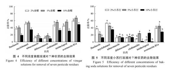 不过,安徽农业大学的研究者,也进行了测试(选择的农药类型和前面的有不同),结果发现,5%的食醋对这些农药的处理整体上比小苏打要好。