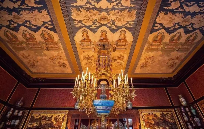 枫丹白露宫中国馆天花板的缂丝佛画像。