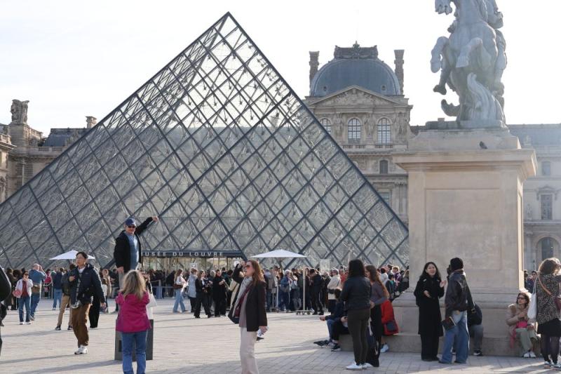 2025年10月22日,在法国巴黎,大量游客聚集在卢浮宫博物馆的玻璃金字塔入口前。新华社