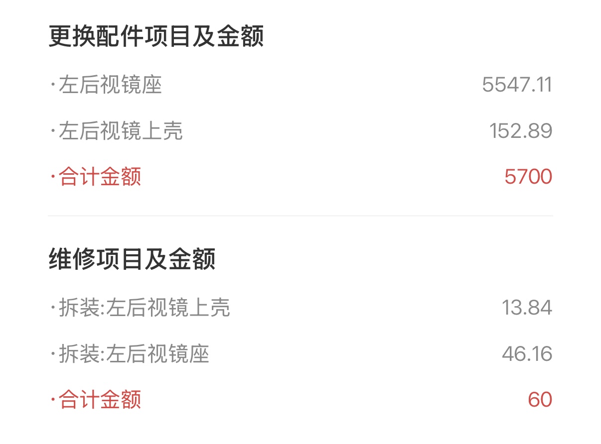 更让郑女士头疼的是,由于该车型的部分配件在当地并无现货,需要从外地调配。4S店给出的定损金额为5700多元,并且表示,车辆需要留在店内等待配件到货,安装完毕后再通知她来取车,整个过程预计需要近一周。“我当时就蒙了,一个后视镜接近6000元。”郑女士回忆道,“而且这几天没车用,上下班、带孩子都很不方便。”
