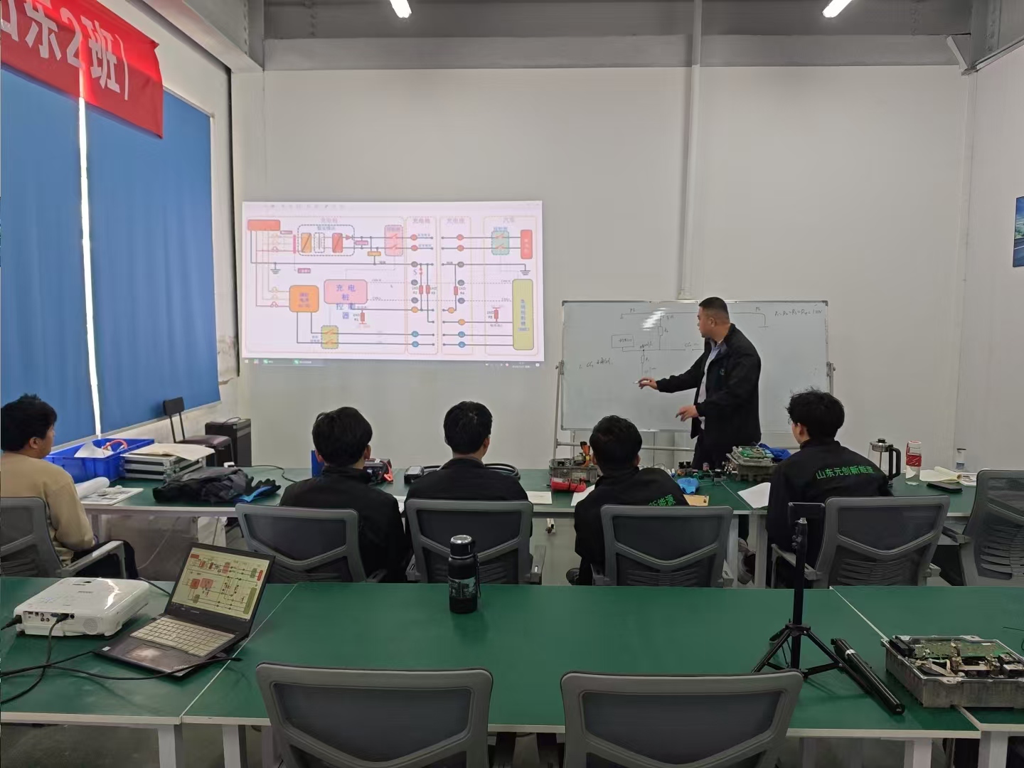 山东元创新能源技术培训课堂上,周老师正在为学员系统讲解新能源汽车快充逻辑原理。