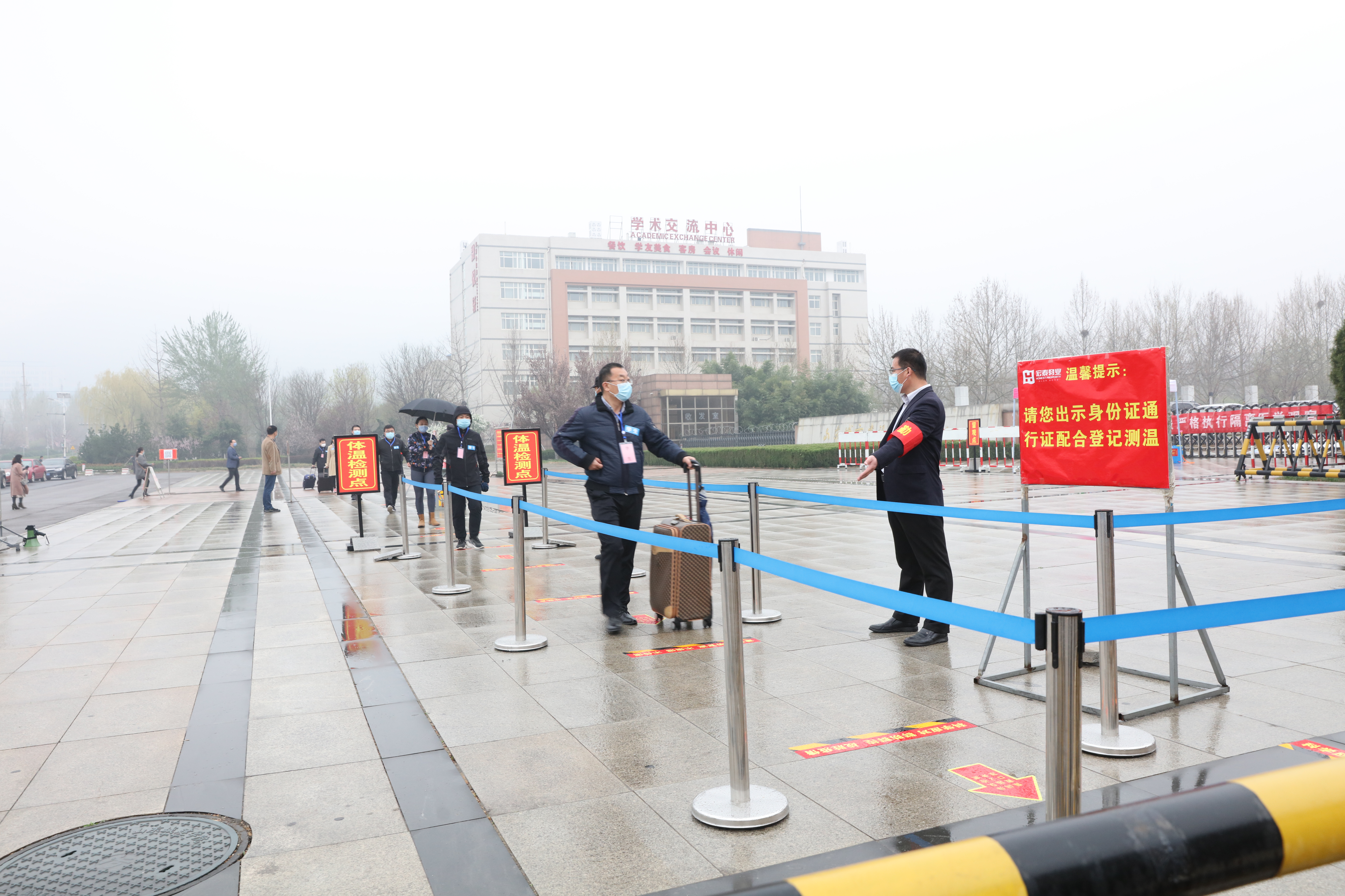 在学院东大门,学校专门设置了机动车、非机动车和行人入校通道,学生乘坐车辆返校时,在秩序维护员指引下在指定地点下车,依次到等候区排队进校,首先扫学院的二维码,经确认后进入通道,由秩序维护员对行李箱进行消毒,再进入热成像筛查测温通道检测,并进行身份证和人脸识别系统的核验后进入校园。