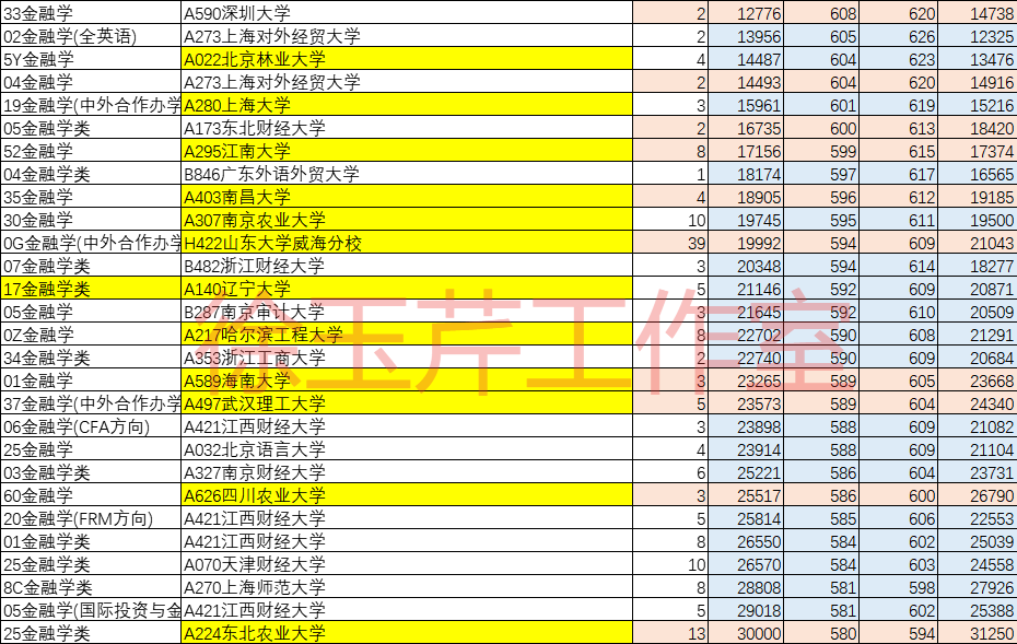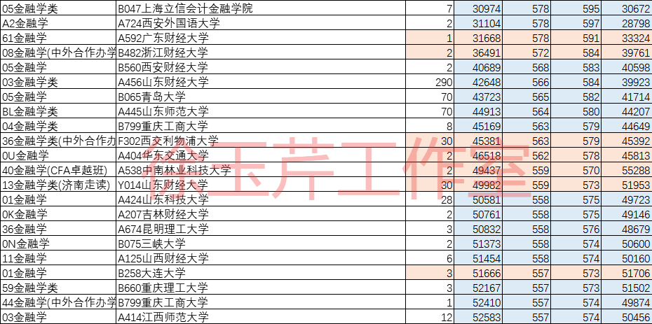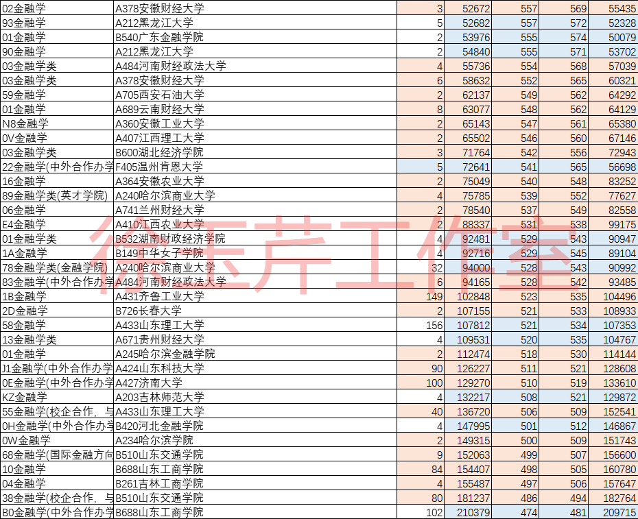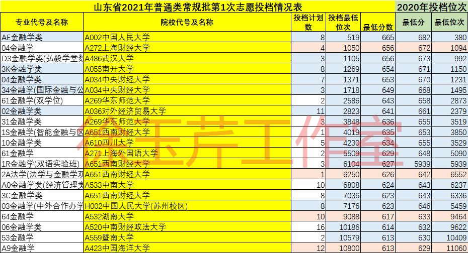 另外,西南财经大学金融学类(智能金融与区块链金融)2020年最低投档位次是3850,今年是4019;中南财经政法大学金融学专业2020在山东投档最低位次是9622,今年则到了10186,下降了564个位次,等等。