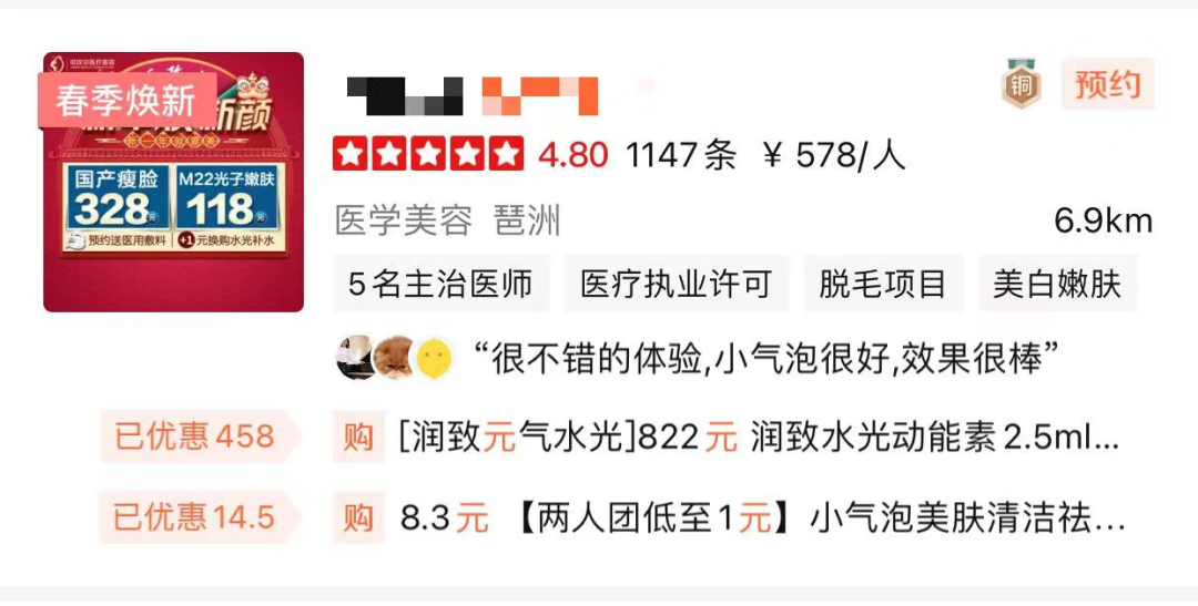 记者查询大众点评app发现,不少医美机构给出了“难以覆盖成本”的低价促销项目。某家医美机构的0.5ml的爱芙莱玻尿酸以促销价190元发售。据了解,该品牌玻尿酸正规美容机构的正常售价为1000至3000元/ml。