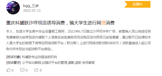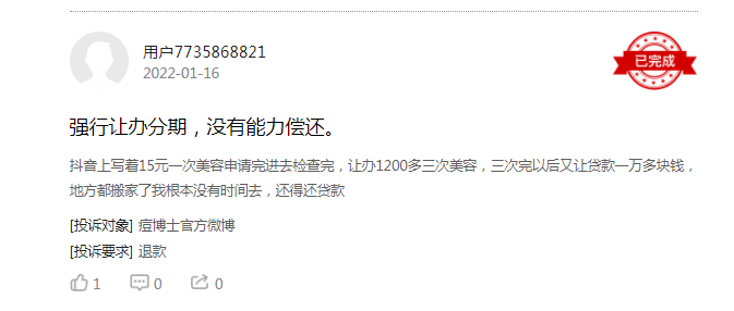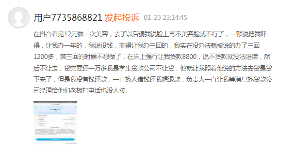 记者在黑猫投诉平台检索“美容贷”关键词,相关投诉量高达上千条。其中,不少消费投诉称,自己在社交媒介上看到机构发布的低价体验广告,到店后却被告知原先购买的套餐无法使用,或者在项目体验过程中被临时加价,一些人会被洗脑借贷消费更高价格的项目,甚至有消费者表示自己在做医美过程中,是对方拿走了自己的手机进行强制操作办理贷款。事后觉得被忽悠了,提出不做治疗要求退款,机构表示无法退款“通过了(贷款)就一定要做”。