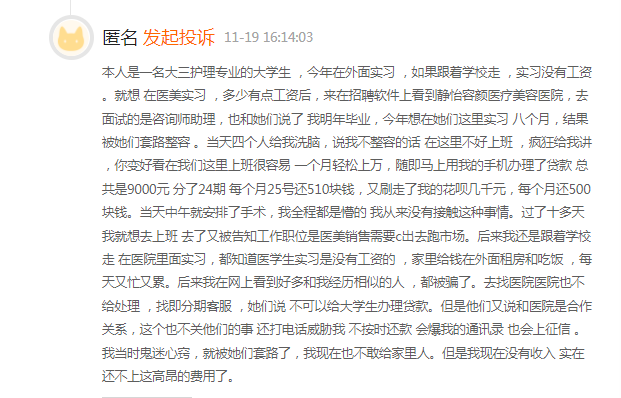 除了”医美骗贷“的问题,机构及医生的资质也一直是争论的焦点。在各大投诉平台的相关投诉贴中不难看出,医美机构的工作人员的话术极具导向性和诱惑性,不断强调“免费”、“便宜”以及通过强调消费者面部存在“缺陷”来营造焦虑,却对真正需要介绍的手术流程、风险、贷款利率等内容只字不提。一些与“美容整容贷”机构相绑定的美容机构,往往是并不正规、不具备相应资质的美容机构。大量投诉贴中指出,医疗机构的工作人员在明知道自己是未成年人或者是刚成年的学生的情况仍极力诱导消费者贷款整容。学生受到忽悠进行医美整形,不仅会面对巨额债务,效果也无法保证。
