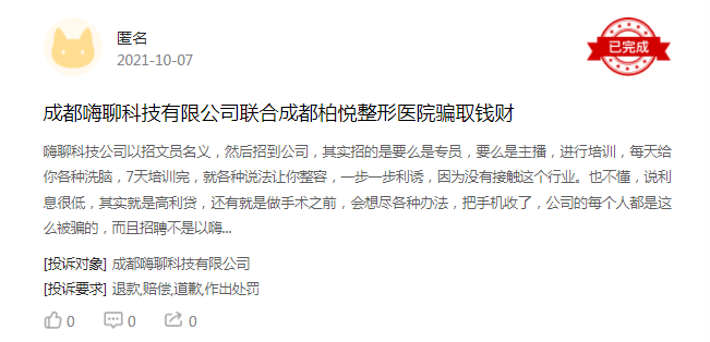 据了解,一些医美机构名下关联公司,以招聘医美顾问、模特、主播、等名义,强调入职后会有极高的报酬,但需要接受“免费”整容以达到岗位所需的五官和身材要求。所谓的“免费”,需要以自己的名义在网上贷款,贷款的钱由公司分期“报销”。完成手术后,有的以不接电话等方式拒绝兑现工作,有的以难以完成业绩指标等理由辞退,更有的直接销声匿迹。
