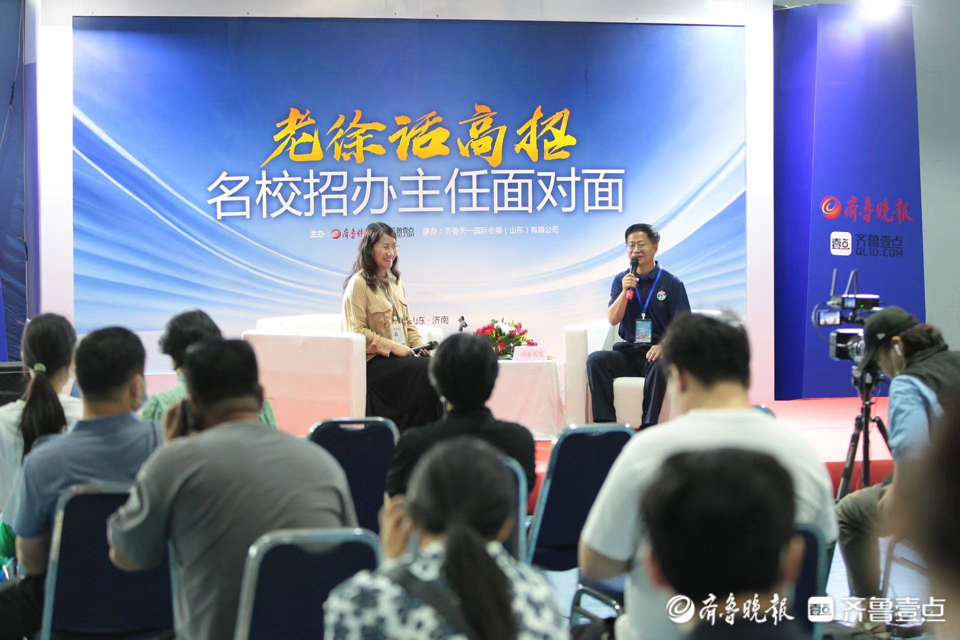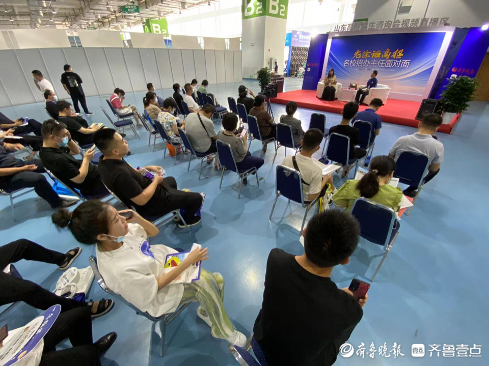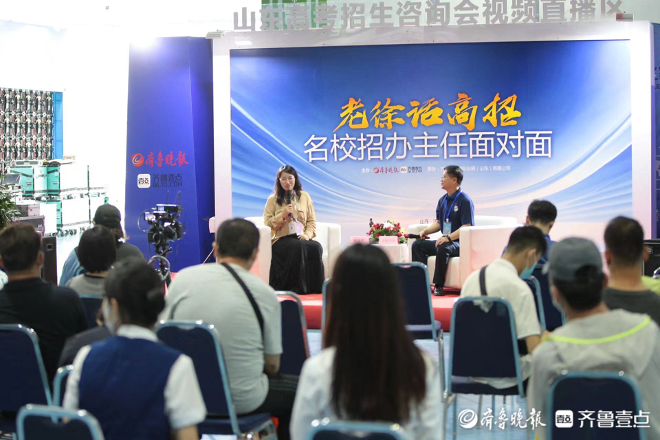 记者王鑫 6月26日,2022年山东高考招生咨询会在济南高新区国际会展中心开幕。在高招会现场的“老徐话高招——名校招办主任面对面”视频直播区,不少高校的招办主任上台向考生家长介绍本院校的招生情况,吸引考生及家长驻足。