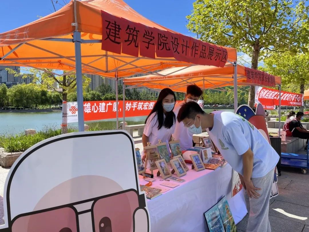 建筑工程学院在展板上张贴的一只只金色纸鹤载满了建工老师对新生的期待与祝福,同时在帐篷下陈列了各色设计作品,向新生展示建工独特思维特色;