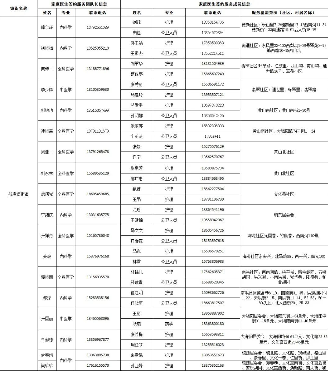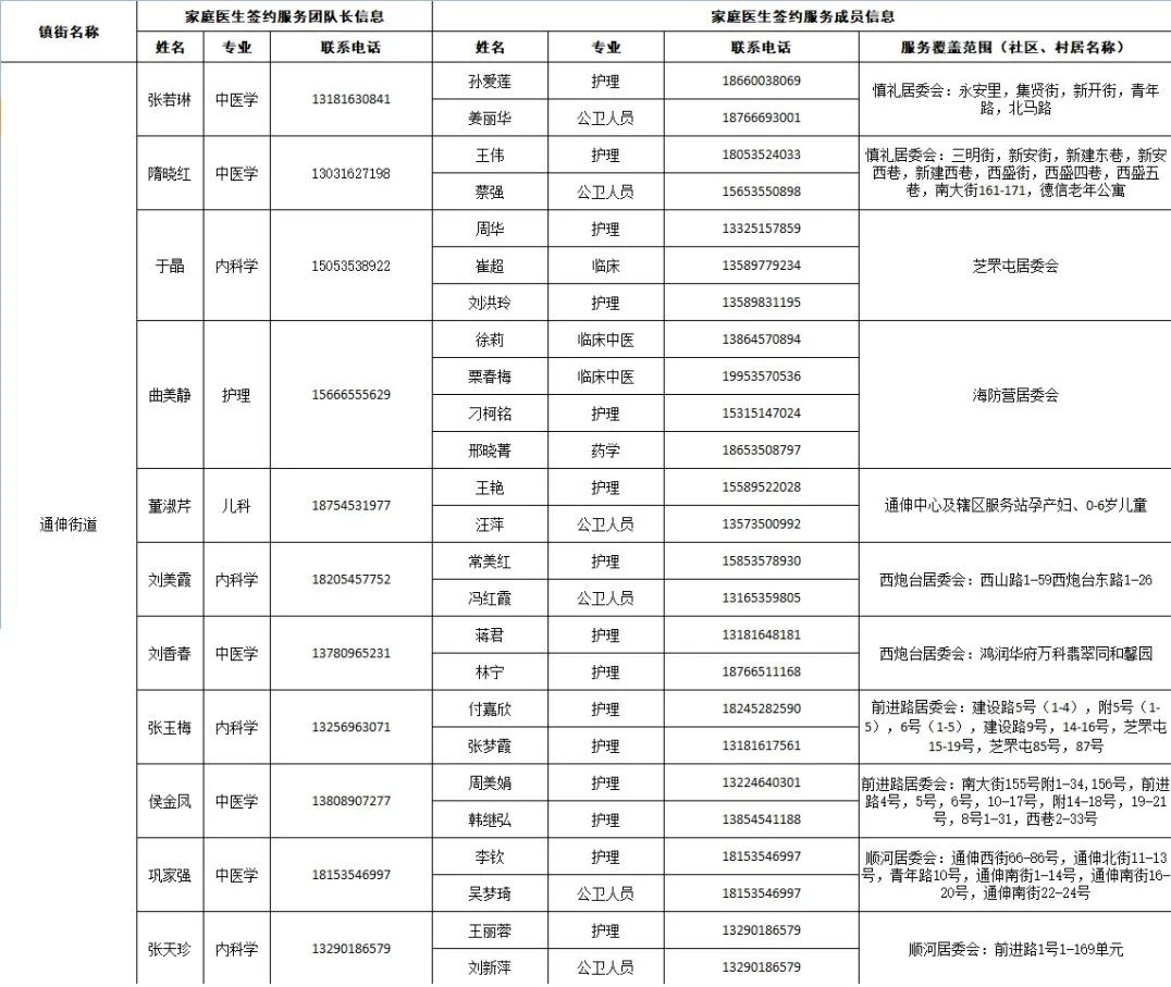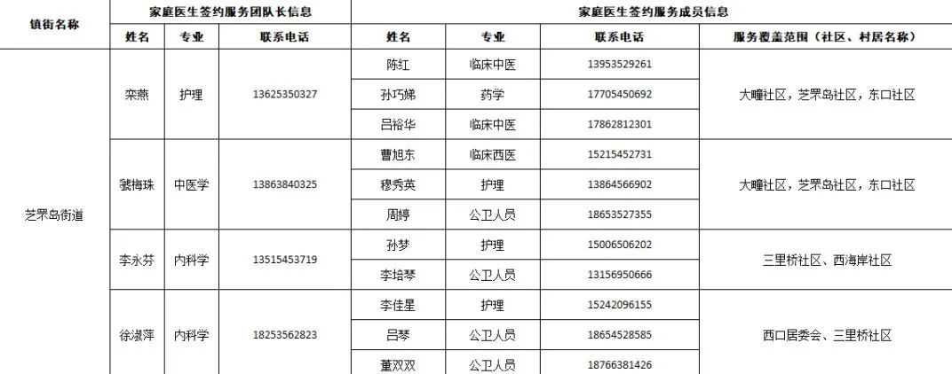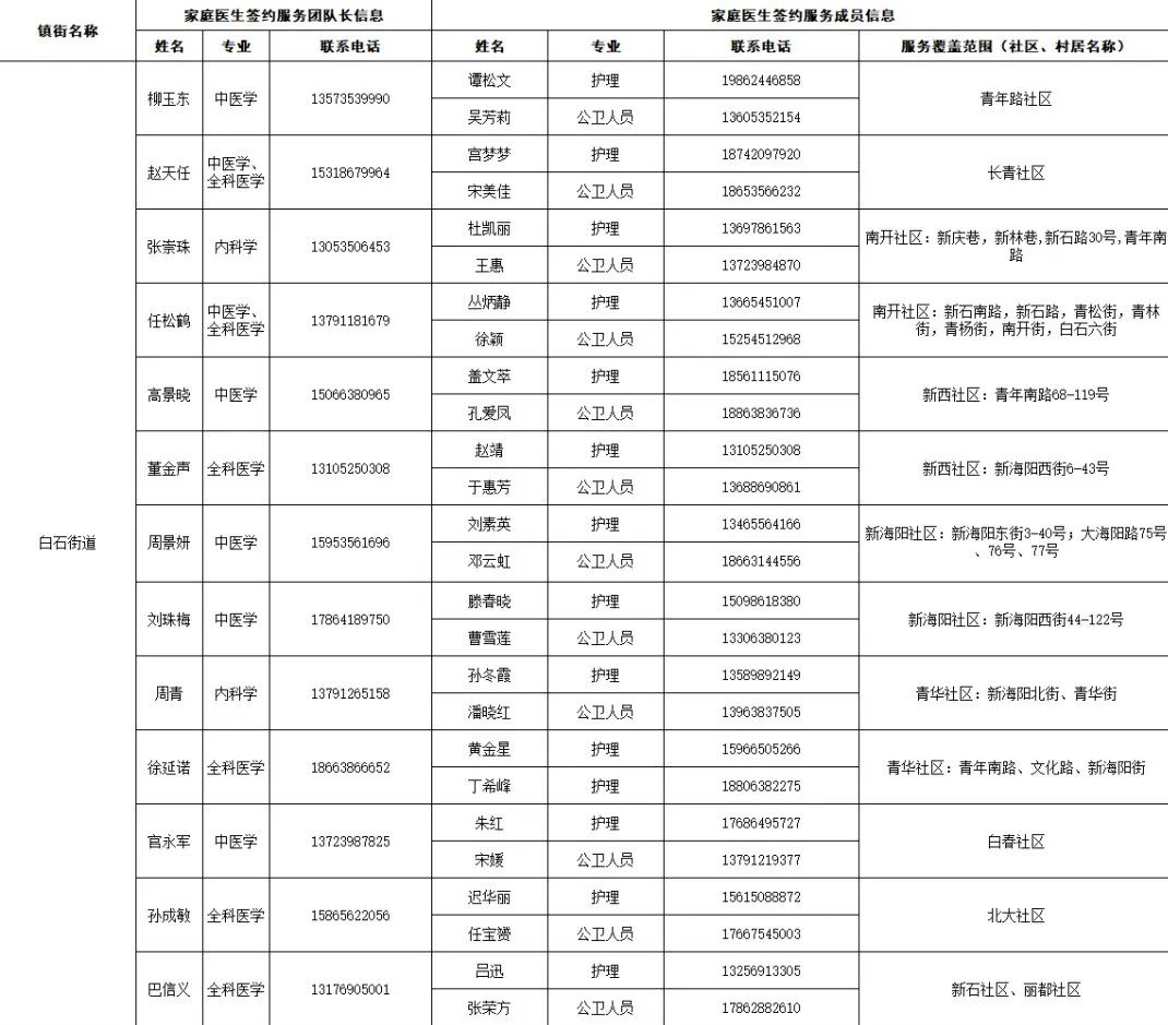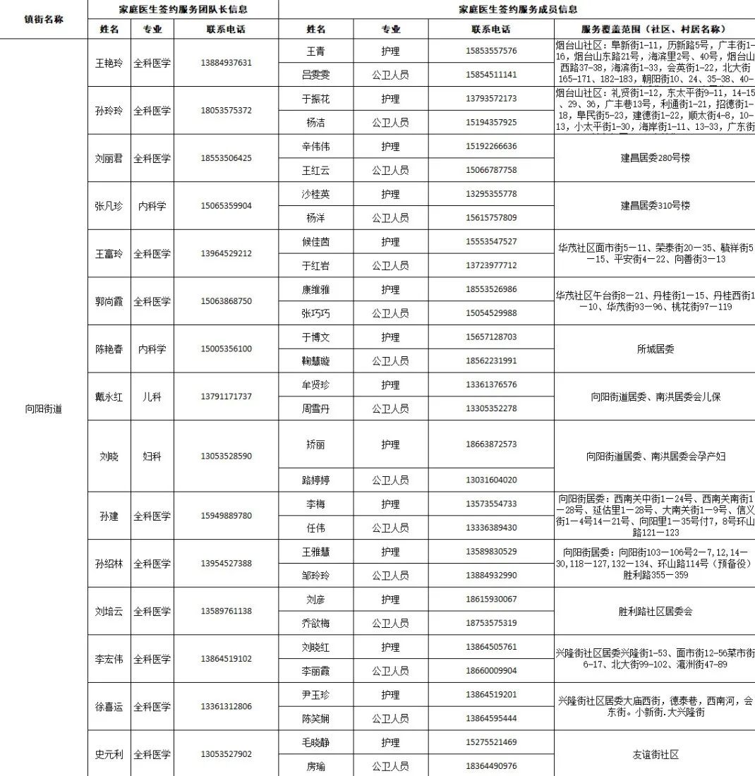据“健康芝罘”微信公众号12月18日消息,结合当前疫情防控形势,为了给大家提供综合、连续、协同的基本医疗卫生服务,现在公布芝罘区各街道家庭医生签约服务团队信息及服务范围。发生危急重症时,请立即拨打120急救电话;非急诊时,可联系家庭医生,进行健康咨询。如果您尚无签约的家庭医生,可通过本信息内的联系方式进行咨询与签约。 附:芝罘区家庭医生签约服务团队信息及服务范围公示 只楚街道 黄务街道 凤凰台街道 通伸街道 芝罘岛街道 世回尧街道 奇山街道 白石街道 毓璜顶街道 向阳街道 东山街道 幸福街道
