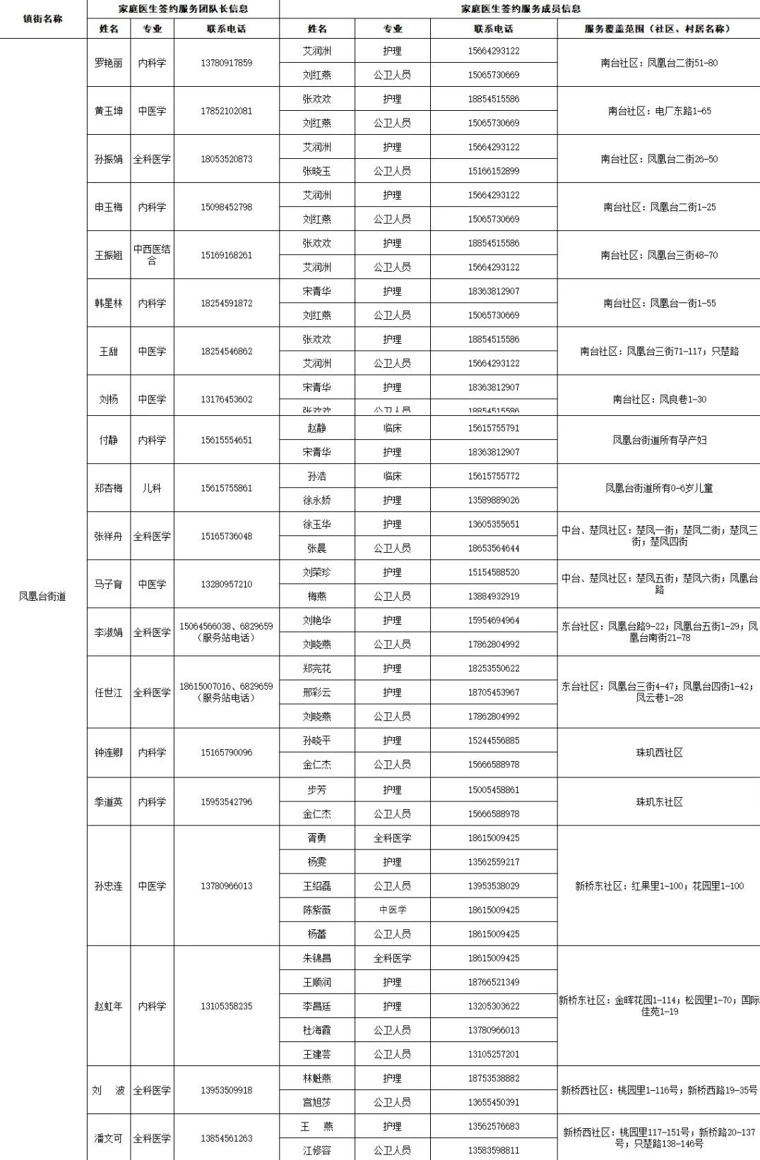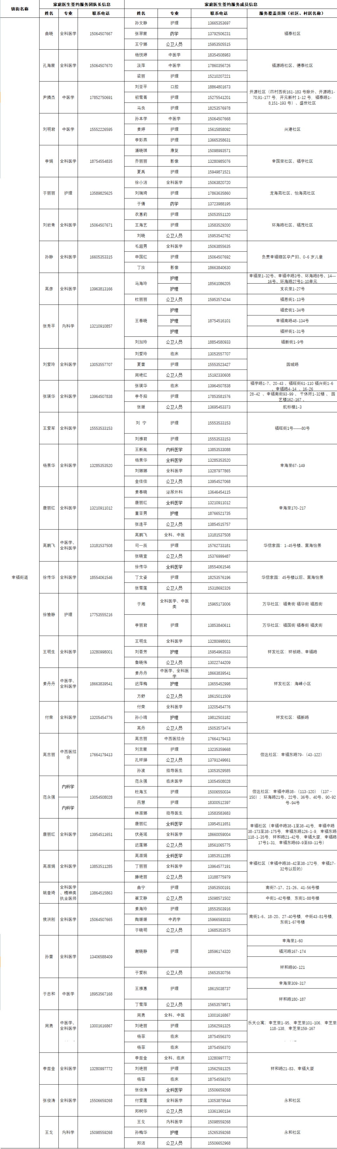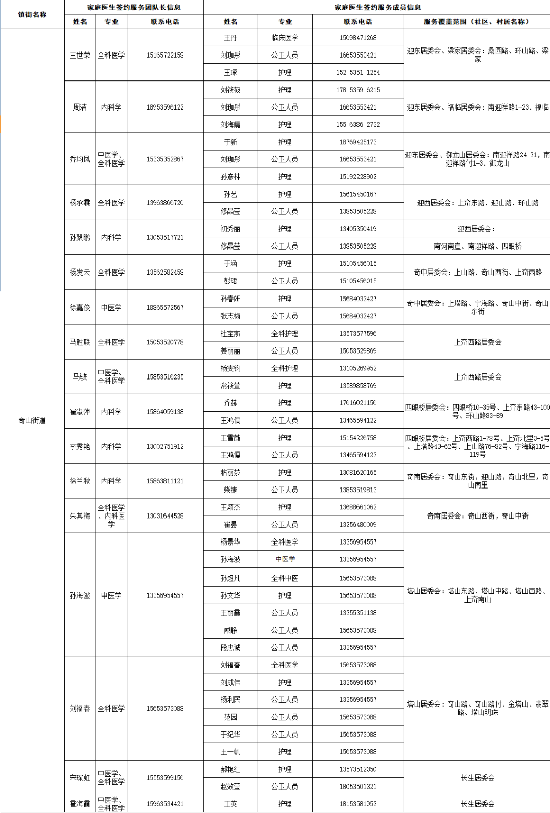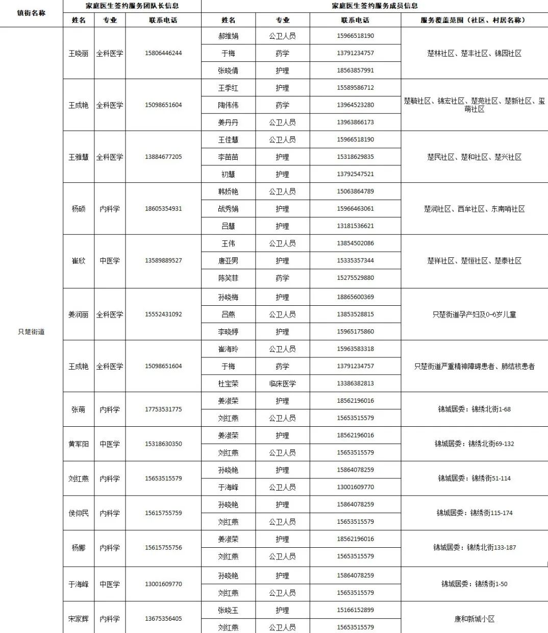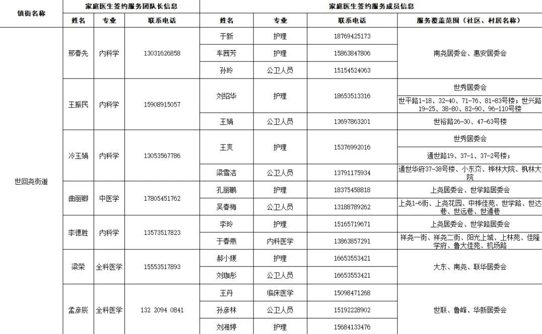 据“健康芝罘”微信公众号12月18日消息,结合当前疫情防控形势,为了给大家提供综合、连续、协同的基本医疗卫生服务,现在公布芝罘区各街道家庭医生签约服务团队信息及服务范围。发生危急重症时,请立即拨打120急救电话;非急诊时,可联系家庭医生,进行健康咨询。如果您尚无签约的家庭医生,可通过本信息内的联系方式进行咨询与签约。 附:芝罘区家庭医生签约服务团队信息及服务范围公示 只楚街道 黄务街道 凤凰台街道 通伸街道 芝罘岛街道 世回尧街道 奇山街道 白石街道 毓璜顶街道 向阳街道 东山街道 幸福街道