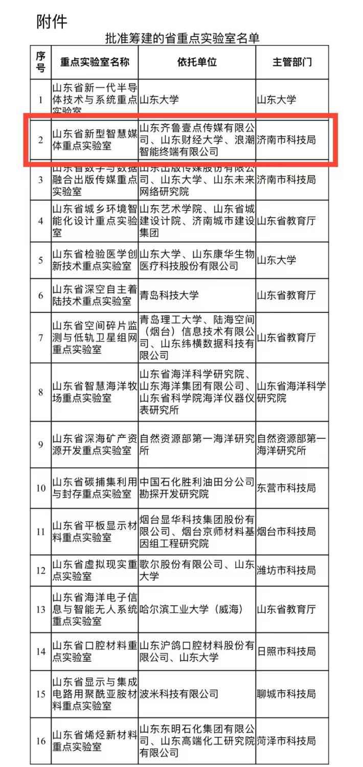 12月30日,山东省科技厅发布《关于批准建设山东省新一代半导体技术与系统等重点实验室的通知》,并公布批准筹建的省重点实验室名单,共有16家省重点实验室获批筹建。其中,由山东齐鲁壹点传媒有限公司(以下简称齐鲁壹点)、山东财经大学、浪潮智能终端有限公司共同申报的“山东省新型智慧媒体重点实验室”榜上有名。这是山东主流媒体获批的首个省级重点实验室,也是齐鲁壹点智慧传媒建设工作的重要成果。