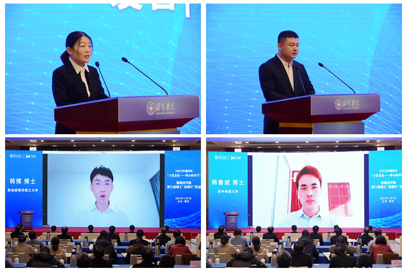 学校刘霞博士、曹玉鹏博士代表在校教师发言,分享自身专业发展及经历,表达了对学校提供相关人才政策和发展平台的感谢。新加坡南洋理工大学韩博博士、华中科技大学韩鲁斌博士在发言中表达了广大人才对潍坊发展的关注和对潍坊市以及潍坊学院相关人才政策的欢迎。
