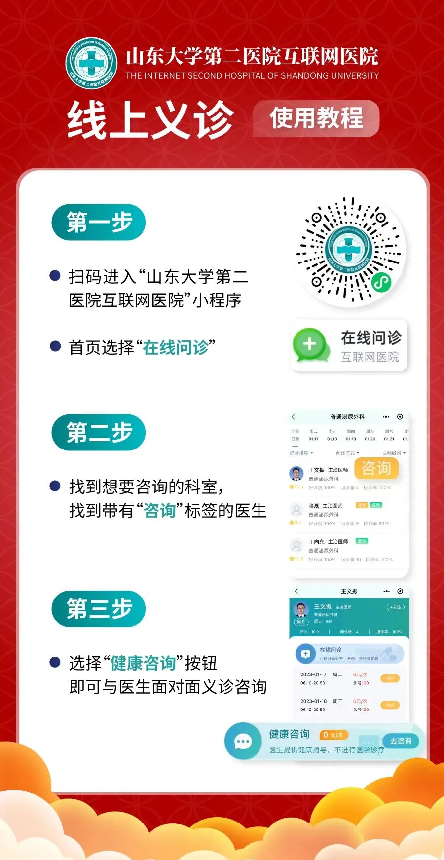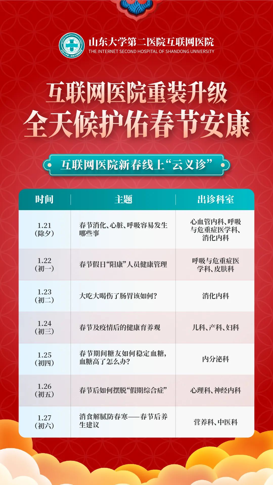 1月18日,山东大学第二医院互联网医院重装升级上线,实现百姓足不出户网上就医取药,面对春节假期常出现的“节日病”,大年三十到初六每天一场线上“云义诊”活动,由心血管内科、呼吸与危重症医学科、消化内科、内分泌科、营养科、中医科、心理科、神经内科等多学科专家领衔,通过“云端”守护,让百姓过个祥和健康的春节。