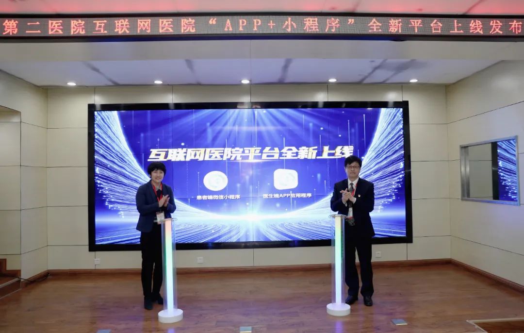 山东大学第二医院党委书记柳丽华、院长冯世庆为互联网医院“APP+小程序”全新平台揭牌。