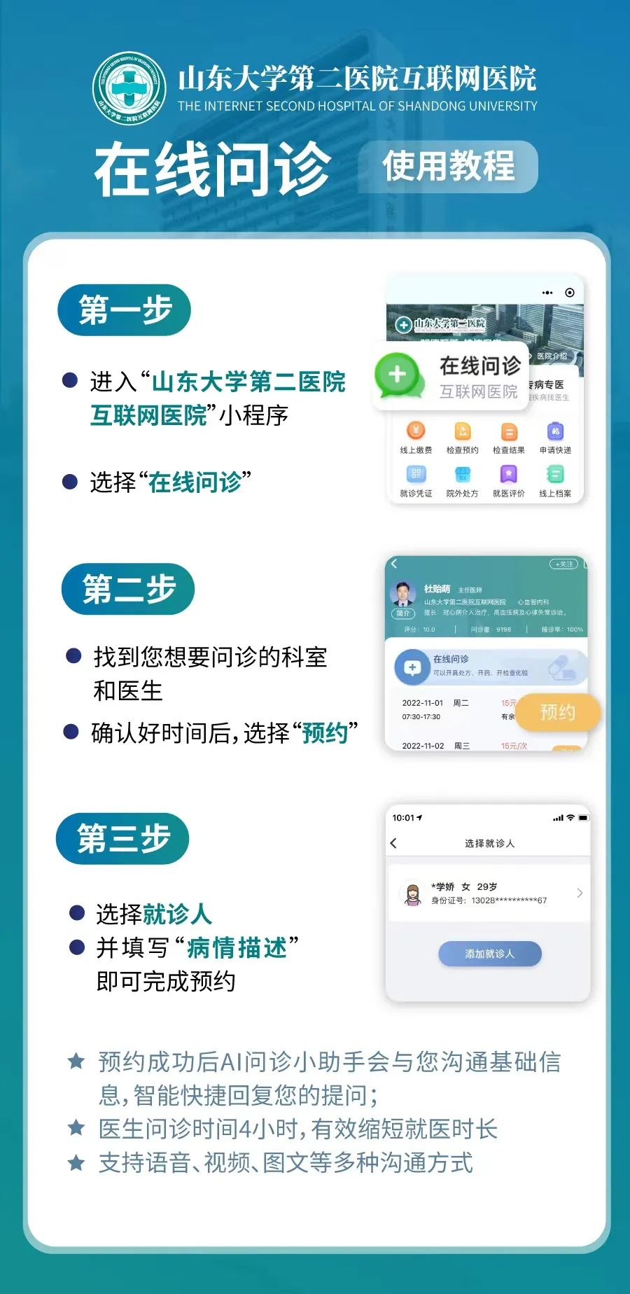 如今,互联网医院再次重装升级,上线“山大二院互联网医院APP+小程序”,就医服务“全覆盖”,就诊盲区“全补齐”,病种专家“全匹配”,特色专病“全明白”,检查检验“全天候”,就诊项目“全到位”,医疗服务“全方位”,便捷快优“全配齐”,预约就诊“全智能”,数字信息“全跑腿”,实现了线上线下、诊前诊后、院内院外、医疗健康、医联体协作五个“一体化”,推行向上向下医疗转诊、线上线下患者服务、院内院外健康管理三个“全闭环”,致力打造省内领先、国内一流的互联网医院平台,让“国家队”医疗资源惠及广大患者朋友和人民群众。