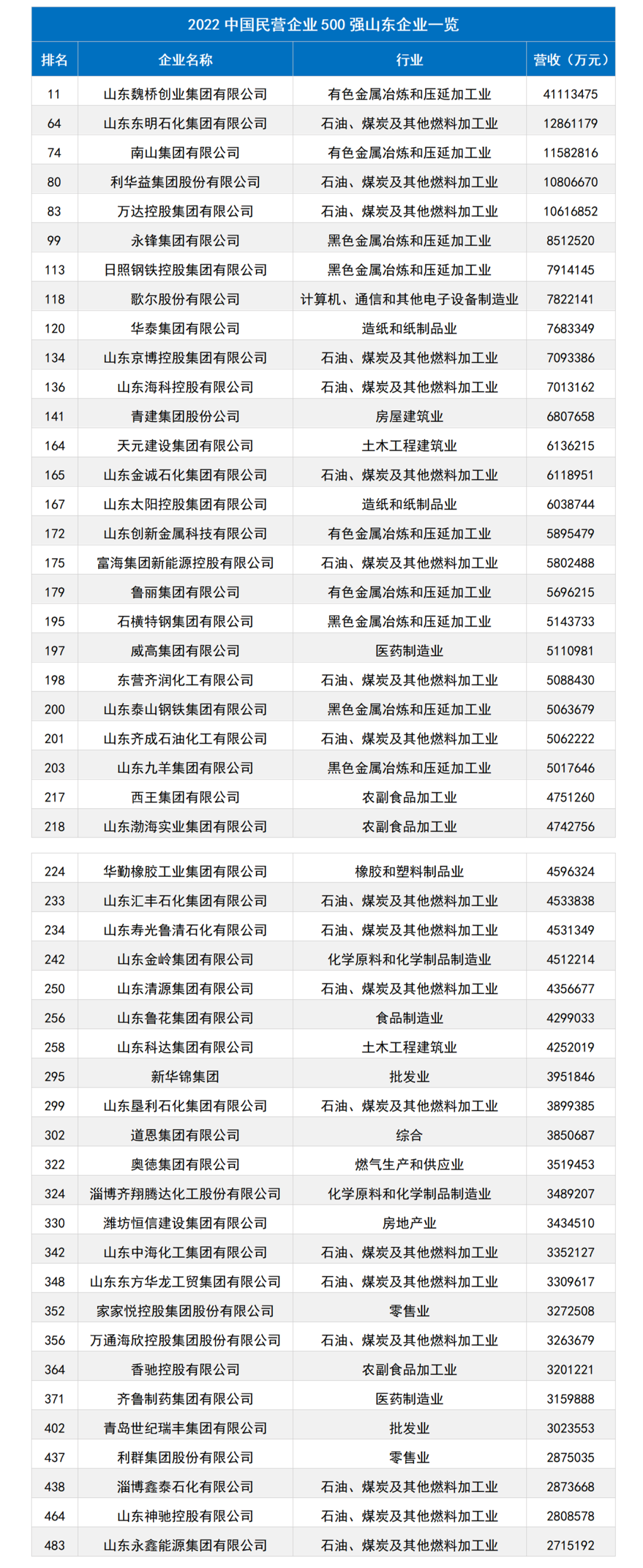 全国工商联公布的2022年中国民营企业500强榜单中,山东共有50家企业进入榜单,位居全国各省市第四位,入围企业数量占500强的比例为10%。统计数据显示,民营经济贡献了山东50%以上的GDP、60%以上的投资、70%以上的税收,占市场主体的90%以上。