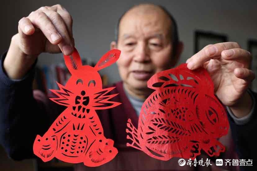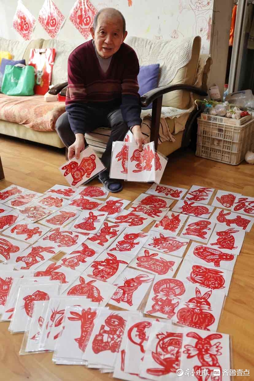 记者 王鑫 2月1日下午,济南手艺人“剪纸王”徐健在家中整理自己的新作品“玉兔呈祥”,为后期的展览做准备。 徐健今年72岁,从小就受家人影响喜欢剪纸,到现在已有65年了。“玉兔呈祥”是徐健从去年春节过后就开始构思的作品,为了将兔子拟人化,剪出不同的神态和动作,他时常去宠物店和动物园观察兔子,从构思到完成用时十个月,剪出了150余幅形态各异的生肖兔。 据了解,徐健计划在正月十五前后,将“玉兔呈祥”系列作品展出,让人们在传统文化中感受兔年气氛,为大家送上美好的祝福。