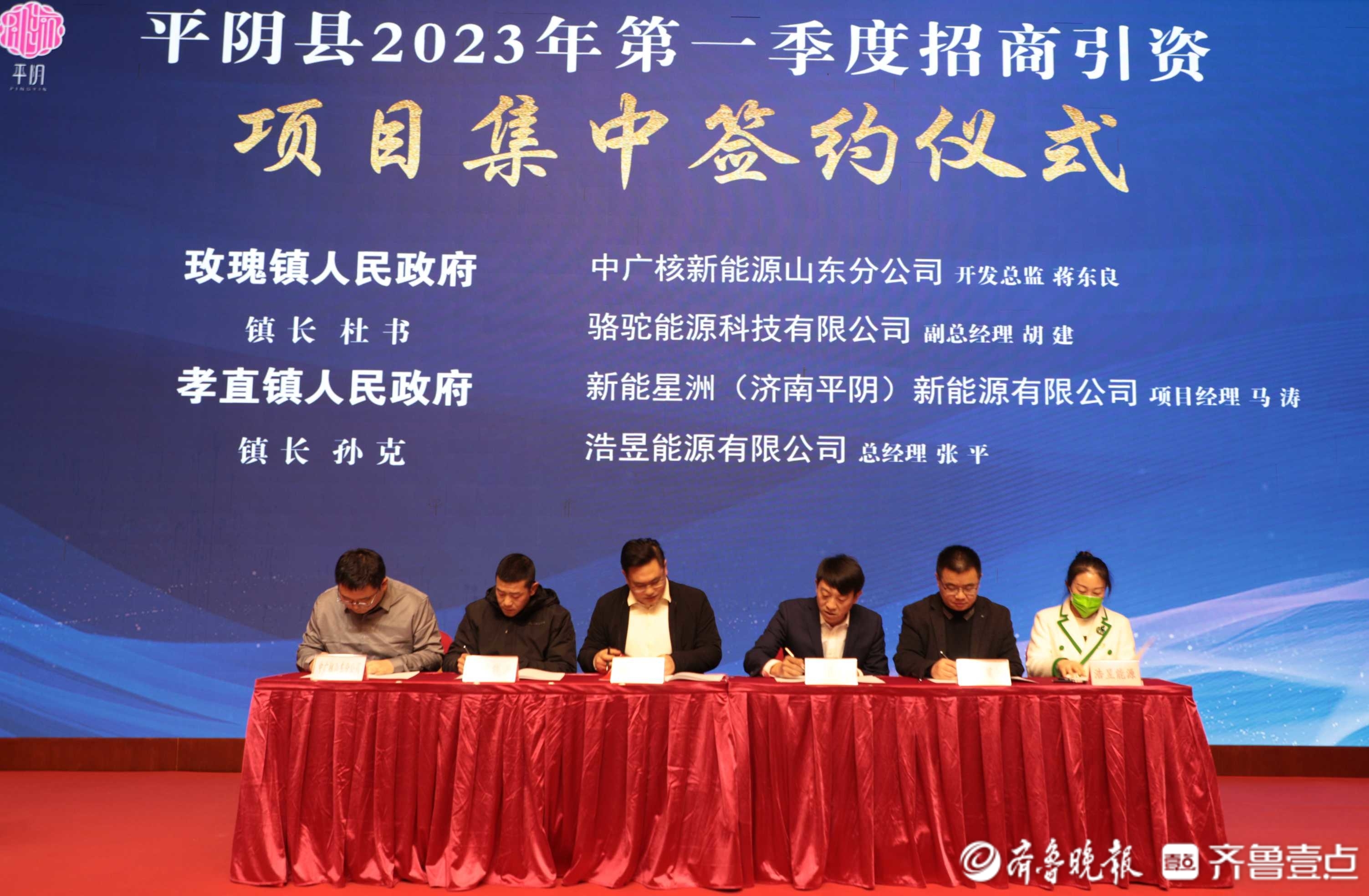 签约仪式现场,平阴县委常委、常务副县长李培振与中安信业(北京)公司、中石油天然气销售山东分公司、时代低空(山东)有限公司、山东种业集团进行了签约;平阴经济开发区与深圳紫荆产业园有限公司、无锡艾斯格科技公司、济南旭海医药公司、中海建济南进行了签约;榆山街道与衡水建胜橡塑科技公司、山东锦泽实业集团,锦水街道与山东智开重工机械公司、万维半导体(山东)公司进行了签约;安城镇与挚量智控科技(山东)公司、山东明冉再生资源公司、山东鲁保科技开发公司,孔村镇与北京清新环境节能科技公司进行了签约。玫瑰镇与中广核山东分公司、骆驼能源科技公司,孝直镇与新能星洲有限公司、平阴浩昱能源公司进行了签约;东阿镇与保利文化集团、山东中域农业科技公司,洪范池镇与北京中尊伟业公司进行了签约。