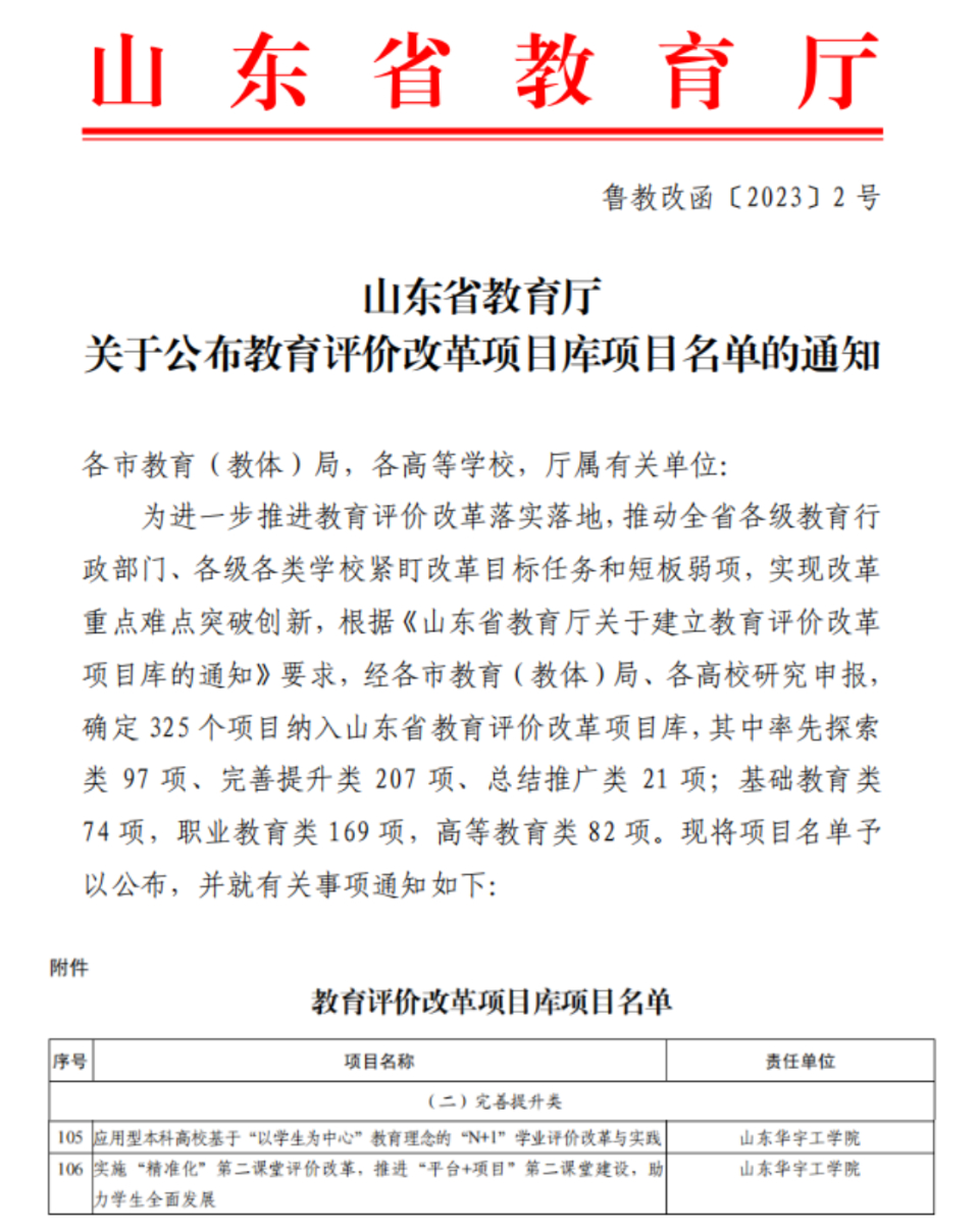 近日,山东省教育厅发布《关于公布教育评价改革项目库项目名单的通知》(鲁教改函〔2023〕2号),山东华宇工学院《应用型本科高校基于“以学生为中心”教育理念的“N+1”学业评价改革与实践》和《实施“精准化”第二课堂评价改革,推进“平台+项目”第二课堂建设,助力学生全面发展》两个项目入选。