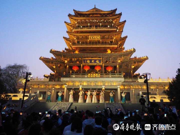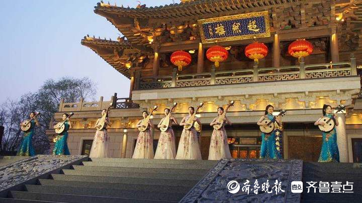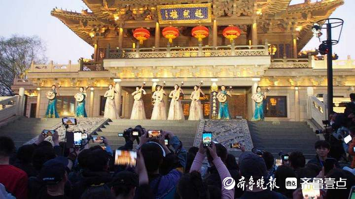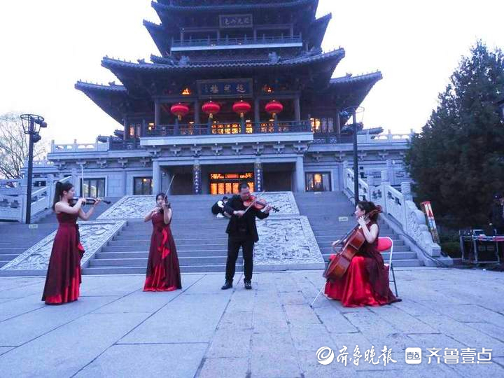 6点20分,超然楼亮起明亮璀璨的灯光。在悦耳动听的琵琶声中,山东艺术学院女子弹拨乐团的同学们从楼内翩然走出,在楼前平台演奏了一首传统名曲《春江花月夜》,清脆悠扬的乐声,令现场观众听得如痴如醉。