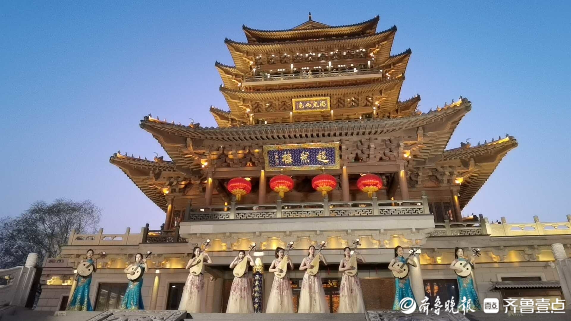 随后,超然楼中十位汉服仙子翩然而出,她们怀抱琵琶、中阮,演奏着弹拨乐重奏《春江花月夜》,乐曲通过流畅多变的节奏,不少游客都将这一绝美过程记录下来,口中啧啧称赞,“羡煞济南山水好”,“有心常作济南人”。