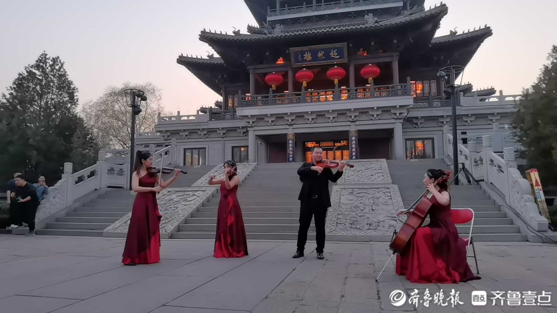 让刘女士意外的是,当天的超然楼亮灯增加了“文艺点亮泉城”超然楼二十四节气快闪。就在距离超然楼体亮灯还有五分钟的时候,一队着华服女子怀抱提琴鱼贯而入,她们演奏了改编自莫扎特《G大调弦乐小夜曲》的弦乐四重奏,节奏活泼流畅,与惊蛰节气春雷乍动、万物生机盎然不谋而合。紧接着旋律变换,哈萨克族民歌《玛依拉》接续上演,音乐高亢嘹亮,将现场氛围推向高潮。
