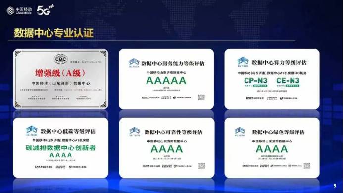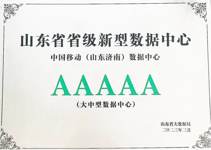 大会对2023年全省一体化算力网络建设进行了工作部署,发布了全省一体化算力网络核心区、集聚区所在市的2023年算力基础设施年度提升计划,同时为评选出的山东省省级新型数据中心进行授牌。其中,中国移动(山东济南)数据中心以综合得分第一名的成绩达到山东省省级新型数据中心最高级别——5A级数据中心标准。