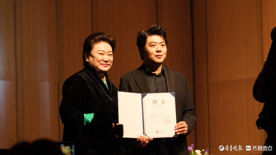仪式上, 山东艺术学院副院长刘晓静为郎朗颁发了山东艺术学院名誉教授聘书。她表示,郎朗先生是世界著名的钢琴演奏家,在国内外享有盛誉,他不仅在钢琴演奏方面成就非凡,在文化交流、公益慈善方面也是贡献颇丰。郎朗受聘学校名誉教授,必将有力促进山东艺术学院钢琴及相关专业的发展,提升学校的人才质量、办学水平、社会声誉。学校将以此为契机,进一步加强人才队伍建设,扎实推动学校高质量发展和现代化高水平艺术大学建设进程。