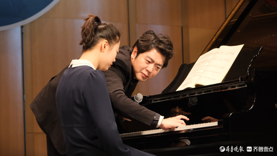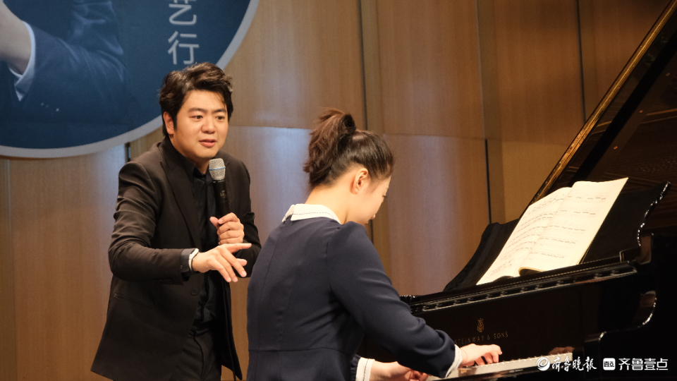 访谈环节结束后,音乐学院钢琴专业学生夏雨菲弹奏了《德彪西半音阶练习曲》,郎朗将舞台变为“课堂”,现场对学生进行指导,将自己对于乐曲演奏的经验倾囊传授,轻松幽默的指导引得现场掌声、笑声不断。