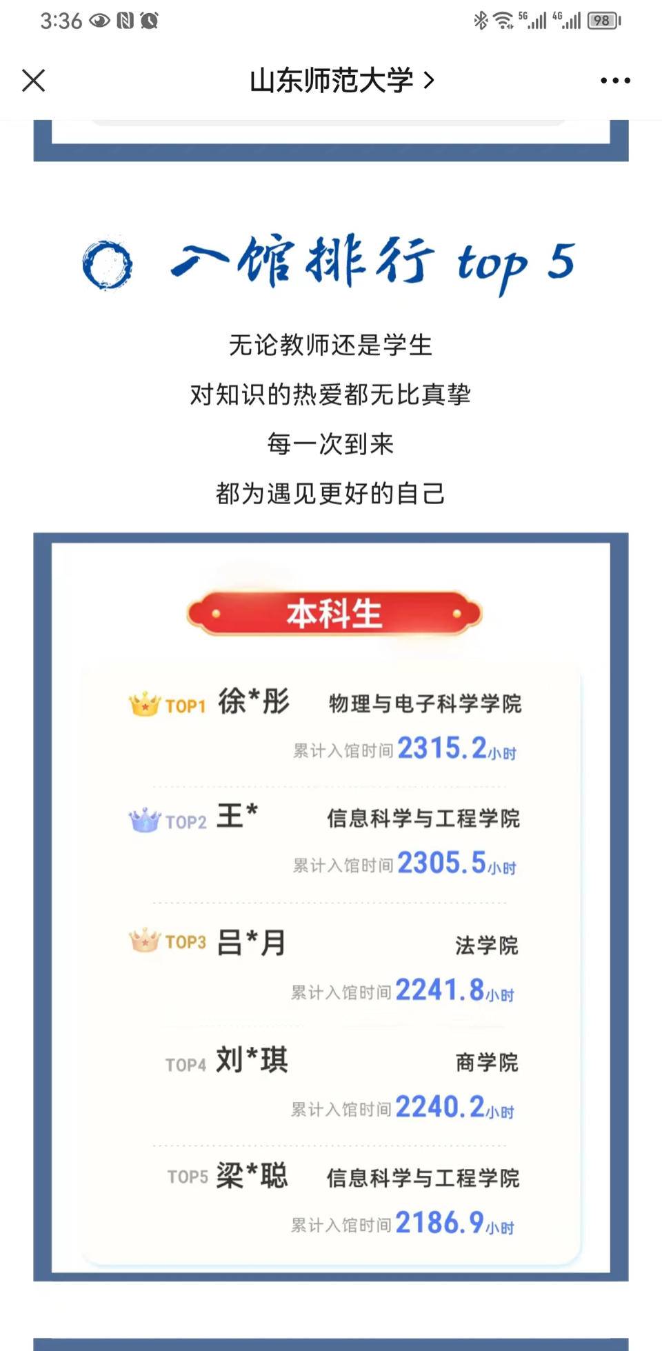 研究生考试已经尘埃落定,徐晓彤也在一家企业开始了自己的实习。当同学把学校官微发布的2022年学生入馆时长截图发给她时,她一眼便认出了那个一年在馆2315.2小时的自己。
